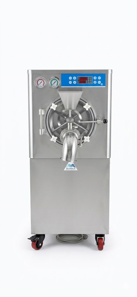Esta mantecadora industrial representa la solución definitiva para heladerías y plantas de producción que buscan escalar su volumen sin sacrificar la textura artesanal. Con una capacidad de producción de 150 litros por hora, este equipo está diseñado para transformar mezclas líquidas en helados de consistencia perfecta en ciclos rápidos y eficientes. Su estructura vertical en acero inoxidable de grado alimenticio garantiza no solo una higiene impecable bajo las normativas más estrictas, sino también una presencia imponente y profesional en cualquier centro de producción.