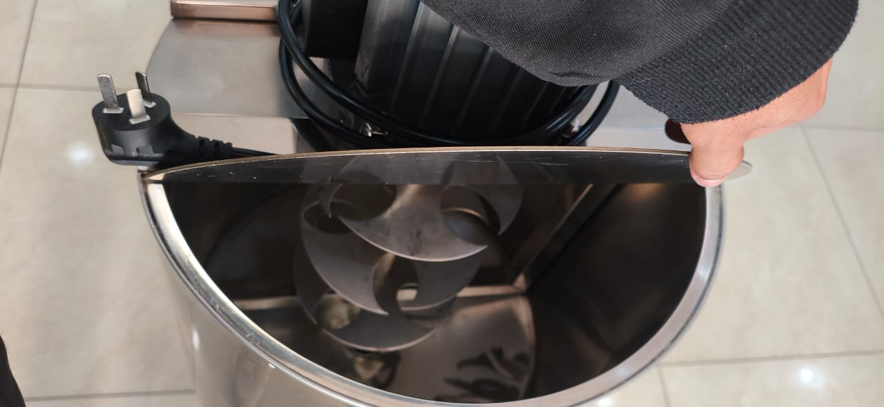 La eficiencia de mezclado se logra mediante un sistema interno de cuchillas helicoidales en acero inoxidable, diseñadas con una geometría de triple aspa que garantiza un movimiento envolvente de la mezcla, eliminando puntos muertos en el fondo del tanque. Este diseño de aspas permite una integración rápida de ingredientes secos y líquidos, logrando texturas uniformes en tiempos récord. La tapa superior de media luna permite una inspección segura del proceso, mientras que el diseño interno facilita que el producto se mantenga en constante movimiento, optimizando la calidad final de cada lote producido.